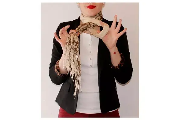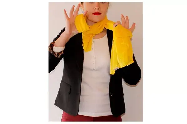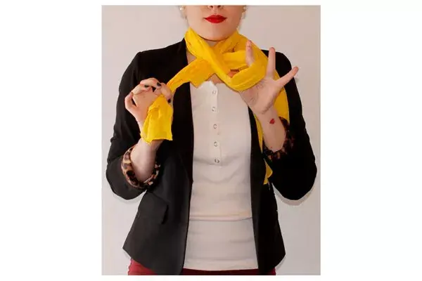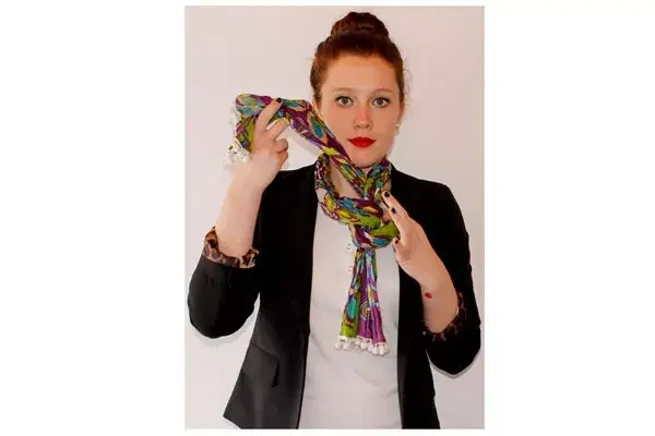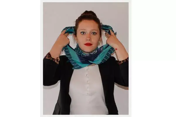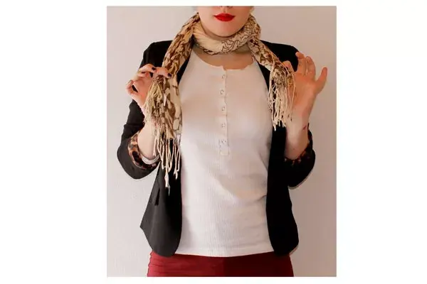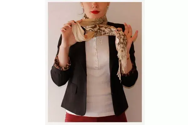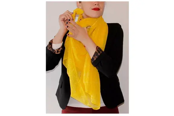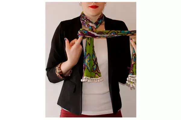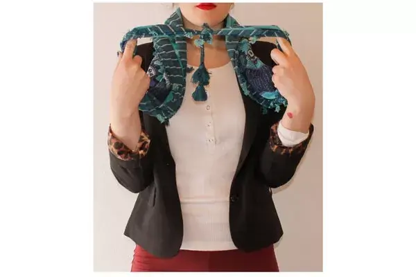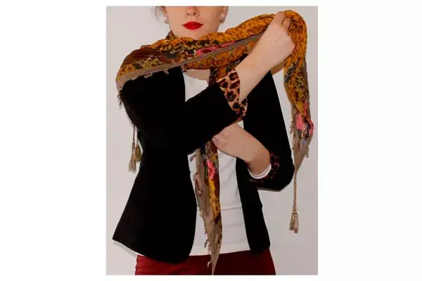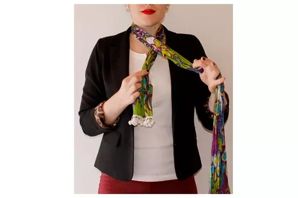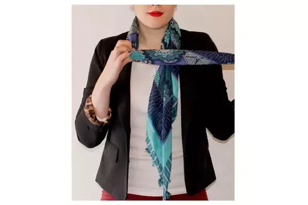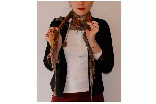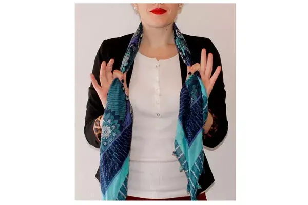 A) Doblá el pañuelo de la forma en que quede más largo. Pasalo por detrás de tu cuello y los extremos que caen hacia delante unilos entre sí.