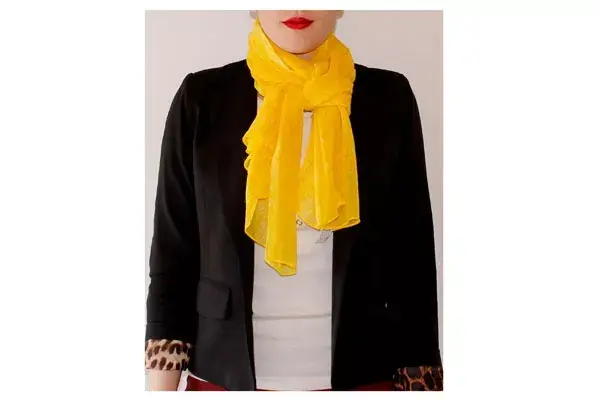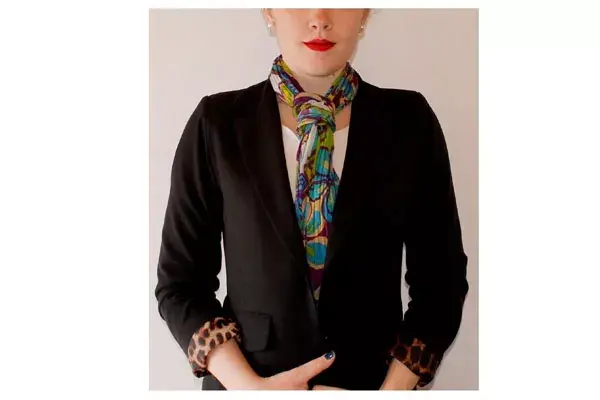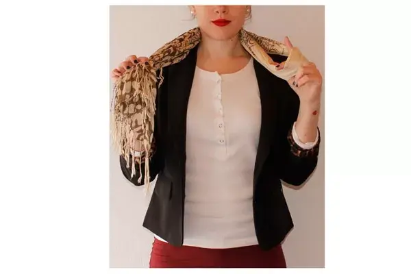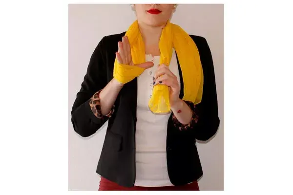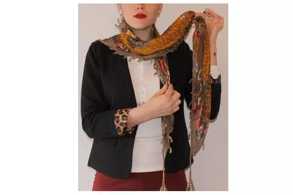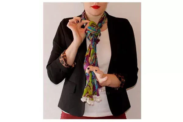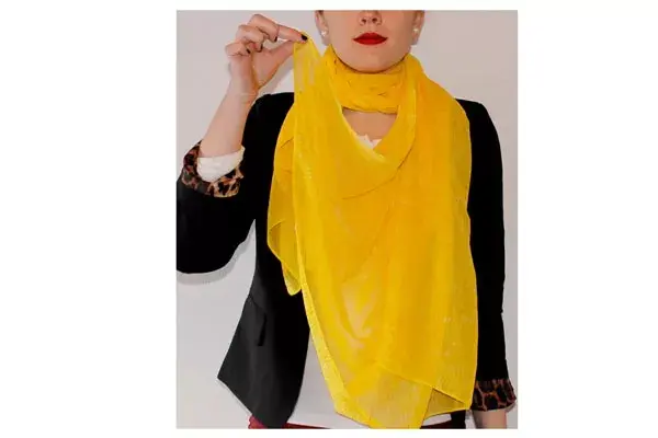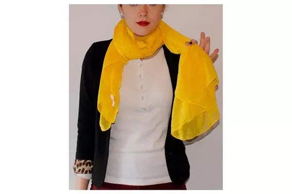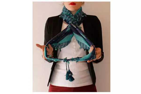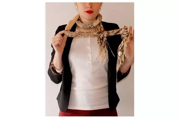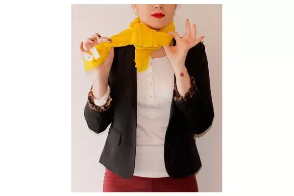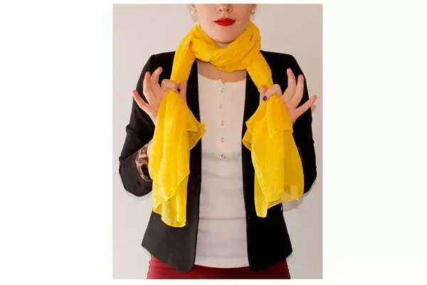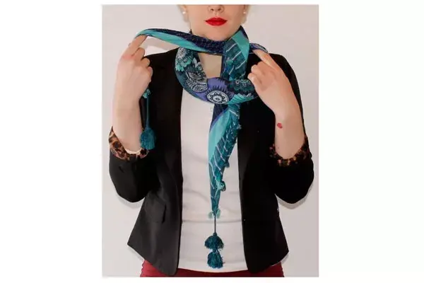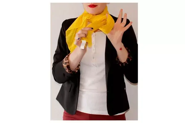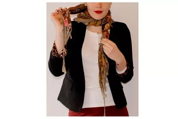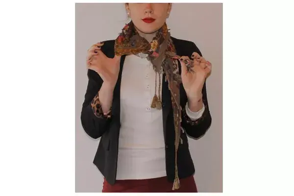 A) Doblá el pañuelo de la forma en que quede más largo. Pasalo por detrás de tu cuello y los extremos que caen hacia delante unilos entre sí.