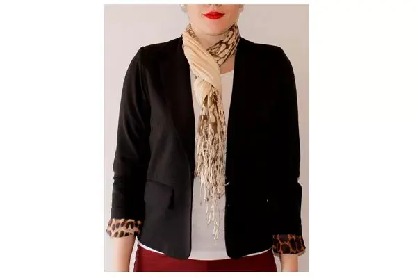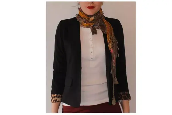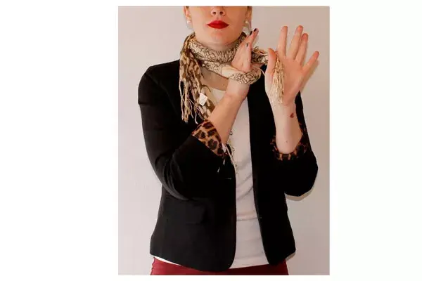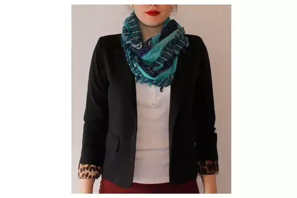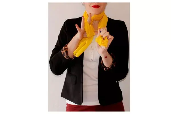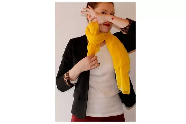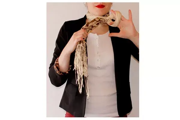 A) Utilizá un pañuelo rectangular, doblalo al medio y pasalo por detrás de tu cuello. Vas a tener en una punta el pañuelo doblado y en la otra sus dos extremos. Abrí la forma que está cerrada y pasa por dentro de ella uno de los extremos contrarios.