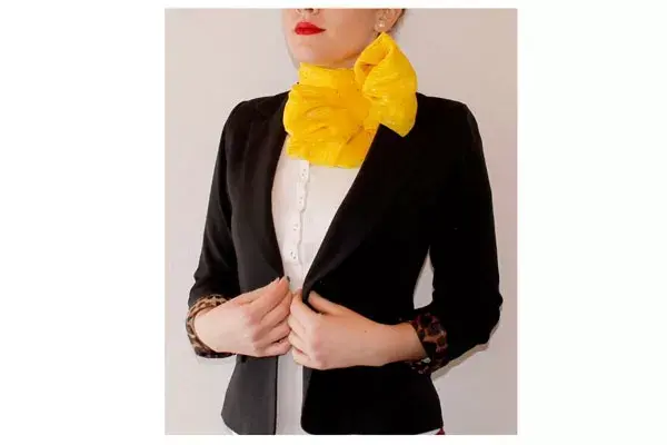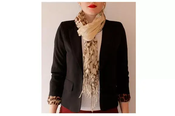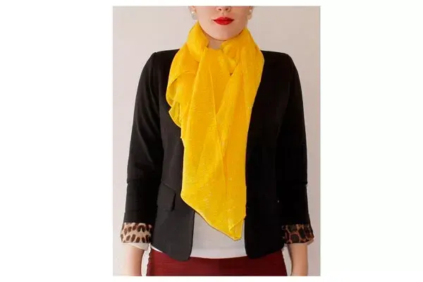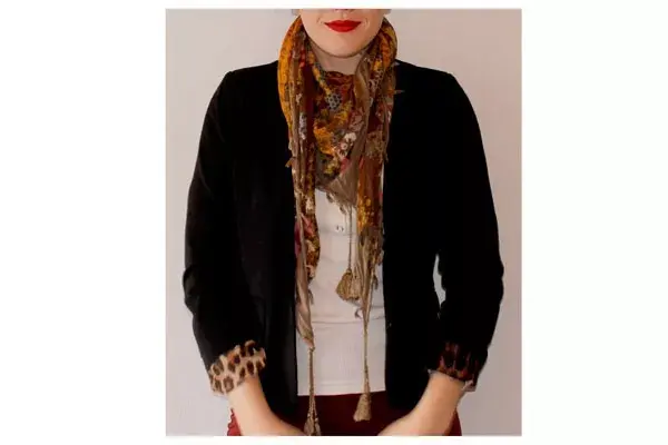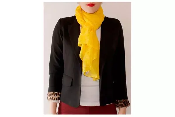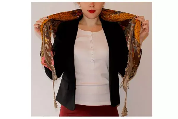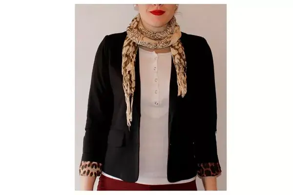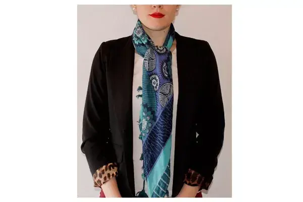 A) Para esta opción te recomendamos un pañuelo triangular. Giralo alrededor de tu cuello teniendo en cuenta que debe quedar un extremo con mayor longitud que otro hacia delante.