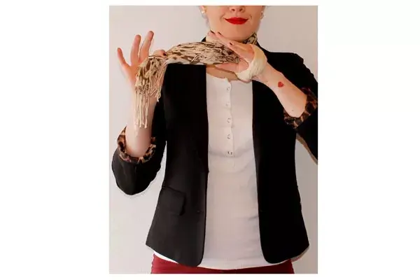 A) Nuevamente vas a enrollar sobre su eje el pañuelo, luego lo doblás al medio y lo pasás por detrás de tu cuello. Abrí el extremo cerrado y pasá el contrario por dentro del mismo.