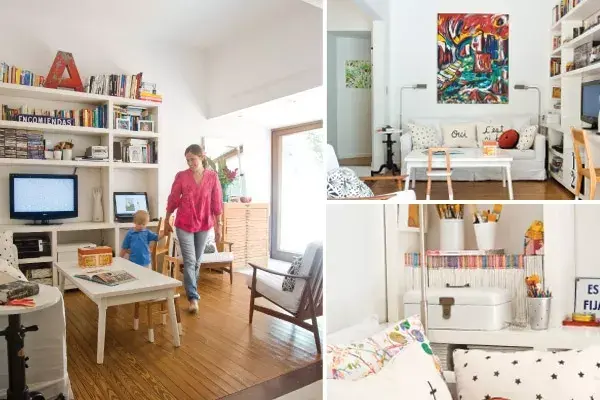 Mucho blanco y madera clara que, sumados al sol otoñal que invade cada rincón de la sala a través del inmenso ventanal, generan un espacio súper cálido. Más allá de que la base de la deco es bastante neutra, los mil y un detalles de la biblioteca y el megacuadro a puro color imprimen personalidad y energía. La letra A de lata colorada (Boulevard Sáenz Peña) es la protagonista principal de la biblioteca; ubicada en la parte superior de esta, cuenta la historia de su pasión por los objetos con pasado. La mesa blanca de La Casa de Agus junto a la minisilla ($1300, Krethaus) es el espacio en donde los chicos juegan y miran videos cuando llegan del cole. La computadora que está integrada a la biblioteca es la que usa para escribir en su blog, la silla es de Boulevard Sáenz Peña, los almohadones pintados también son de La Casa de Agus y el cuadro, un regalo de su primo.