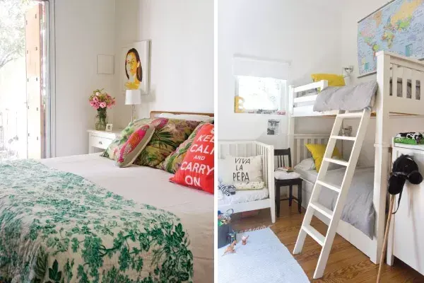 El dormitorio principal es romántico y colorido. Sobre un cubrecama blanco ($900, Ramos Generales), juega con almohadones y pie de cama estampado (ambos de Linos del Pacífico) que puede ir intercambiando para no aburrirse. Arriba de cada mesita de luz puso un retrato a puro color de ella y de su marido. En su mesita, un ramo de lisianthus rosas ($60, TeTe Castells - Delivery de Flores). El cuarto de los chicos, paradójicamente, es mucho más apagado. Sumándose a la tendencia de cuartos infantiles minimalistas, optó por tonos grises con toques amarillos. Los cubrecamas son de Ramos Generales, el de la cuna está hecho con un género de Bla Bla; el almohadón de cebra, de Cosido en Casa; el de "viva la pepa", de La Casa de Agus, y el de los zorritos, de Krethaus ($650). ¿Una buena idea? Un planisferio a modo de cuadro.