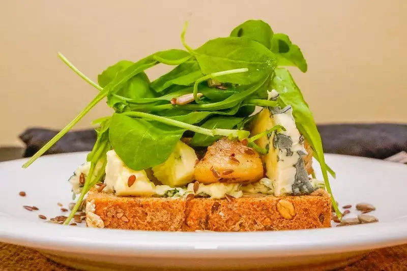 - Entrada: smørrebrød (rodaja de pan negro de molde casero, manteca especiada, peras caramelizadas, queso azul y rúcula)