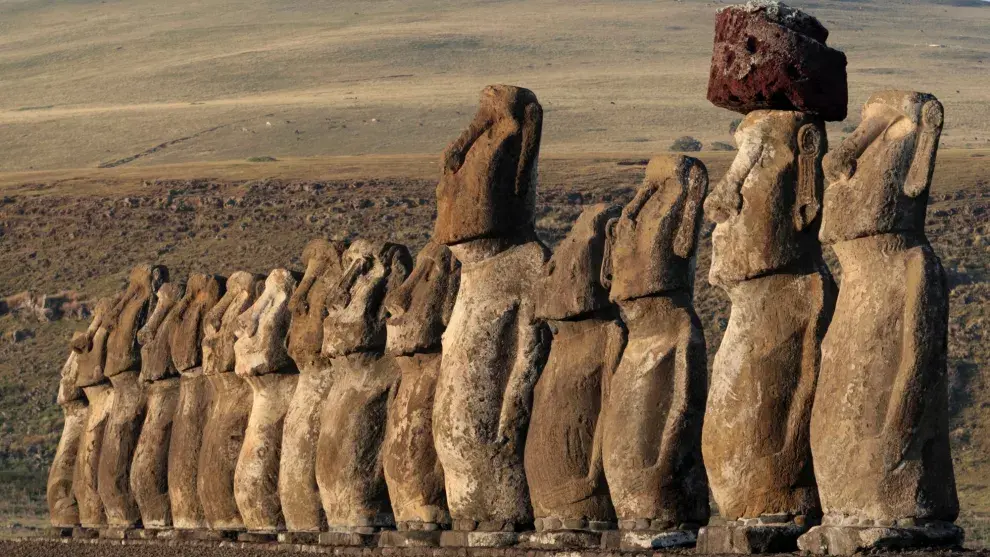 Desde que la isla fue avistada por el navegador holandés Roggeveen en 1722, los moáis nunca dejaron de fascinar a los viajeros y los arqueólogos. La pequeña isla es la tierra habitada más aislada del mundo. Fue colonizada por polinesios que desarrollaron una sociedad muy original, basada sobre una organización clánica que rendía un culto a los ancestros. Los gigantes de piedra son la manifestación más monumental de aquella cultura que colapsó poco antes de la llegada de los primeros europeos y derribó a sus gigantes de roca tallada. Los que se ven actualmente parados sobre sus ahus (plataformas sagradas) fueron restaurados; algunos con su tocado de piedra rojiza y uno solo con sus ojos. Los moáis figuraban ancestros protectores y su poder residía en su mirada. Muchos misterios subsisten en cuanto a su producción, su transporte y el fin radical de aquel culto. Para más confusión, el explorador noruego Thor Heyerdahl desarrolló una teoría sobre un origen incaico de los moáis, basándose sobre un ahu construido con la misma técnica que se usó en Cuzco.