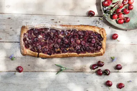 Para la fruta, precalentar el horno a 180 °C. Colocar las cerezas descarozadas y el azúcar en un bowl. Revolver con cuidado para que no se rompa la fruta. Colocar una capa de 1 cm del frangipane en el centro de la masa, dejando bordes de 5 cm para poder doblar sobre el relleno. Sobre el frangipane, colocar las cerezas. Cerrar los bordes de masa. Llevar a la heladera 30 minutos. Cocinar por 35 minutos.