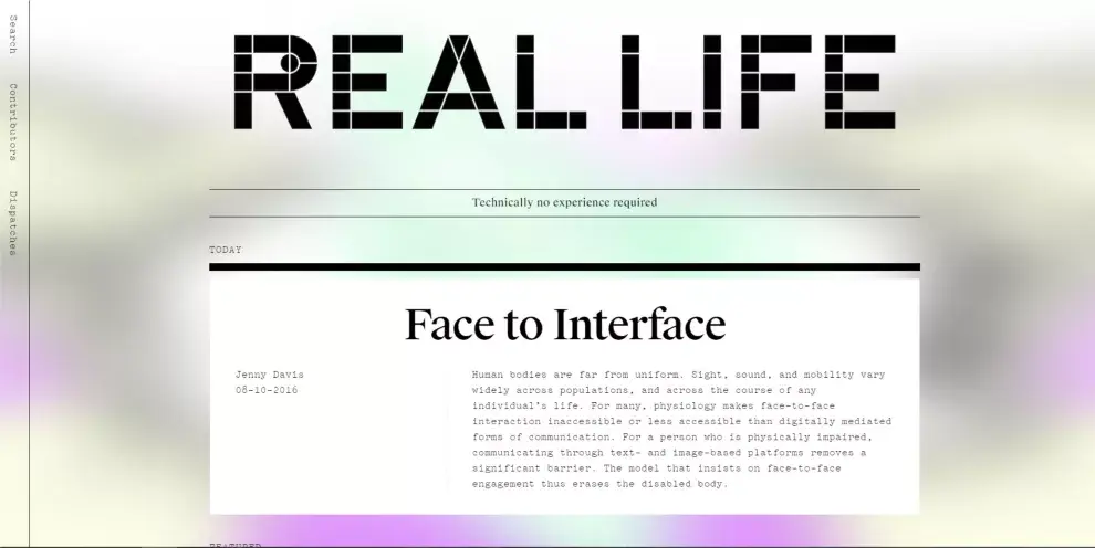 Un desarrollo interesante que propone Snapchat es Real Life, un sitio de ensayos que tratan sobre el vínculo de la tecnología con la vida actual. Más que formación nos propone reflexión respecto de cómo nos relacionamos con el mundo digital y, también, en qué medida a veces confundimos el personaje que compartimos en las redes con la realidad.