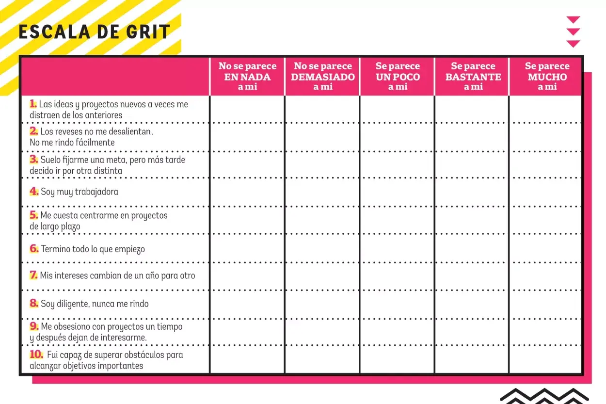 Dato: las frases o preguntas impares reflejan el componente de la PASIÓN dentro del Grit, mientras que las pares corresponden a la PERSEVERANCIA. Con este dato podés calcular el subíndice de Grit para cada elemento por separado, sumá los puntajes y dividilos por 5, así verás en cuál de los estás mejor o peor.