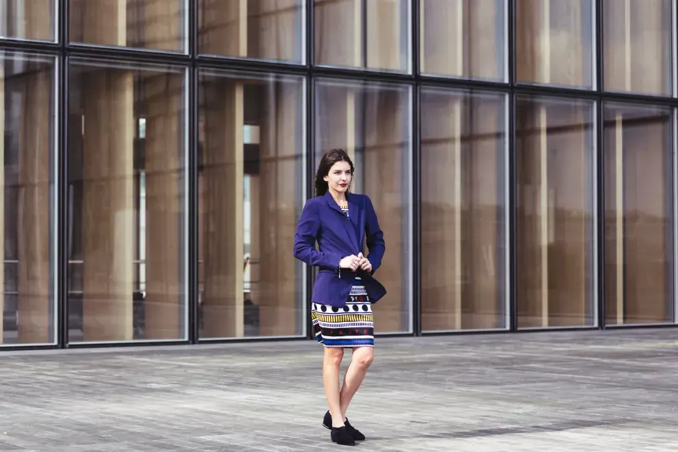 De carácter innovador y llamativo, el look que les traigo en esta oportunidad representa ese contraste entre el pasado y el futuro (por eso también la elección de la locación), mediante un conjunto monocromático de remerita y falda con print de números, letras y códigos de barras. Prendas vanguardistas combinadas con una prenda clásica y simple como el blazer de corte recto y unos zapatos en punta en color azul.