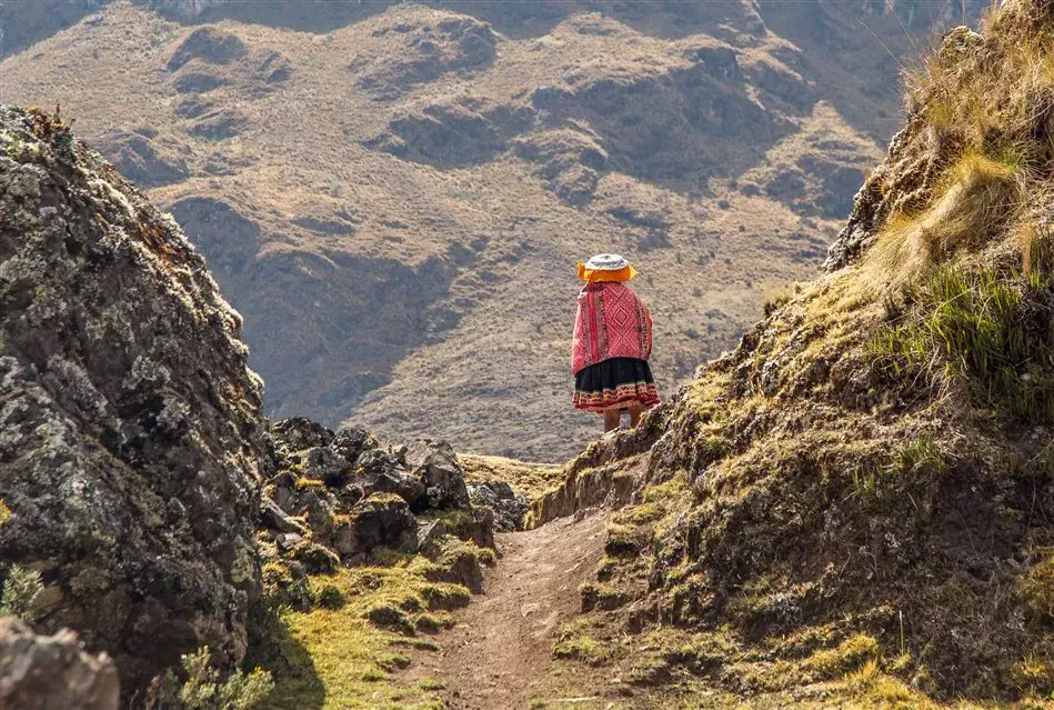 El entorno está anclado en algún lugar impreciso del calendario. Un paisaje rural con mujeres que visten el atuendo típico de los Andes, de faldas multicolores y sombrero de felpa, con la carga depositada sobre sus hombros y la mirada congelada de un fotograma de Sebastiao Salgado.