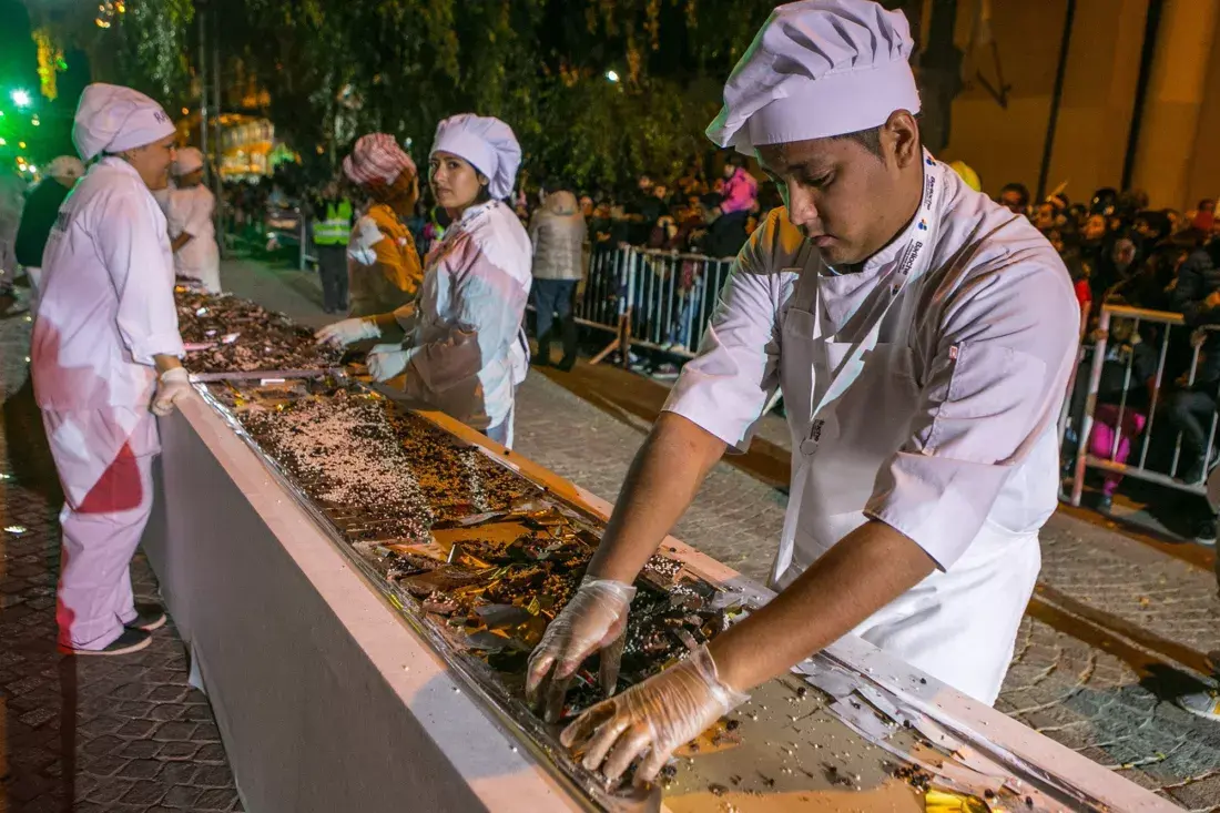 Dentro de unos días el centro de la calle estará ocupado por los maestros chocolateros y decenas de ayudantes que preparan la barra de todos los récords. "Hace unos años hacíamos el huevo de chocolate más grande. Ahora es una barra. Queremos que la fiesta tenga siempre novedades. Este año hemos incrementado las decoraciones", adelanta Lucio Bellora.