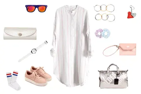 Gafas, XL, $1390. Sobre, Lázaro, $690. Reloj, XL, $2050. Medias, A Pie para Grimoldi, $90. Zapatillas con glitter, Nike, $3999. Maxicamisa rayada, Etiqueta Negra, $5800. Aros, Uma, $800. Llavero, XL, $480. Gomitas de pelo, Como Quieres, $40. Sobre rosa, Lázaro, $390. Bolso, Prüne, $3390.
