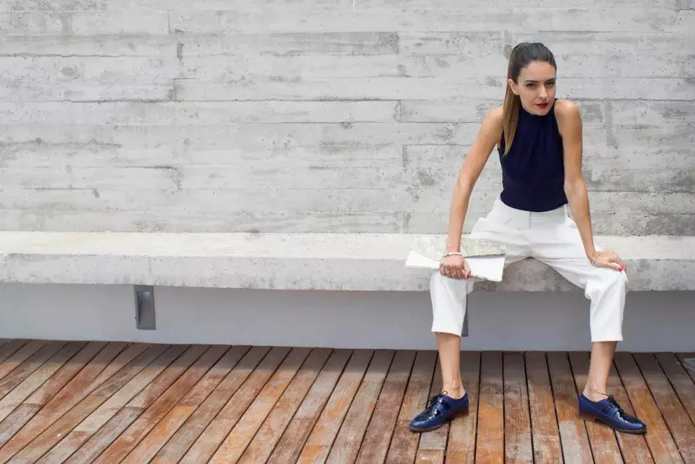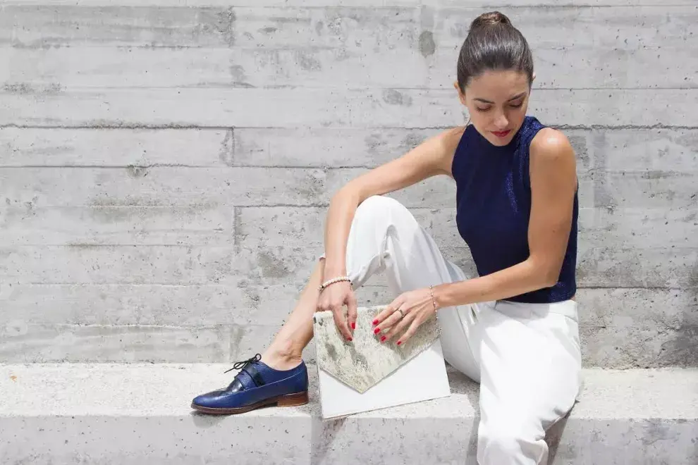 El look de hoy, además de hacer referencia al modernismo y minimalismo como ejes fundamentales, apuesta a un estilo que todos los años se reinventa y que se refiere a una estética masculina. Consiste en un top de lúrex azul con un pantalón de líneas rectas holgado, pero a la vez original en su estructura. Los zapatos serán una pieza clave para lograr que el outfit luzca más varonil y a la vez minimal, por eso la elección de unos mocasines ideales para tiempos de transición. Por último, les presento otro de mis diseños, un clutch rectangular que mezcla vanguardia y originalidad, y que acompaña lo armónico de esta estética.