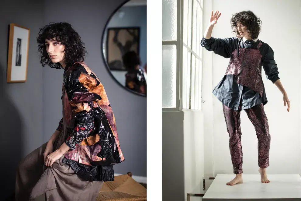Izquierda: campera charolada, Luz Ballestero, $19.500. Vestido de gasa, Belén Amigo, $15.000. Camisa, Levi´s, $4980. Pantalón, Mishka, $4240. Derecha: top engomado, Luz Ballestero, $4900. Camisa impermeable, Belén Amigo, $6900. Chomba, Levi’s, $3690. Jogging engomado, Luz Ballestero, $9980.