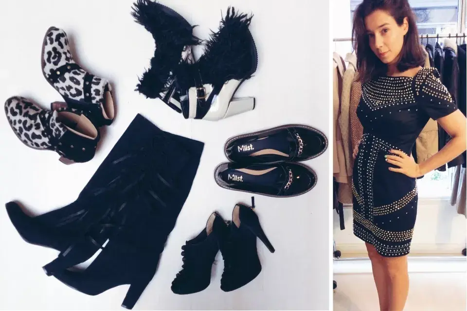 Vestido $890, botas con flecos $350, botinetas animal $450, zapatos peludos con taco $190, mocasines $100, zapatos con taco negros $420.