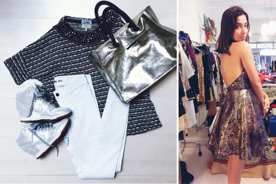 Zapatillas con taco plateadas $390, remera con apliques $190, bolso $370, pantalón de cuero blanco $450, vestido tornasol $120.