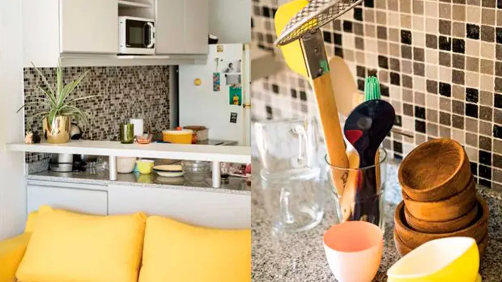 La cocina -que da la bienvenida al depto- es otro de los espacios más usados de la casa, porque a los dos les encanta cocinar. Lu guarda en la cocina su colección de vajilla: los enlozados que heredó de su abuela y los bols rosas (Pez Cerámica) y amarillos (Mercado de Pulgas de Nueva York). Colgado en el perchero de madera, bolso de Mono, la marca de su amiga Mercedes Hernaez.