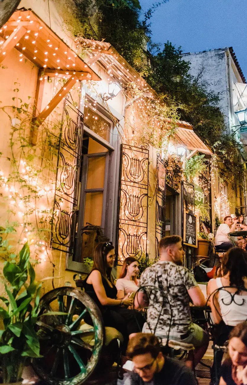 Calle Mnisikleous: es una peatonal angosta, casi escondida en el barrio de Plaka, con escalones de piedra y restaurantes a cada lado de la calle. A la noche se mezclan los locales y turistas, el ambiente es súper sociable y hay almohadones para sentarte en la vereda cuando no alcanzan las mesas.