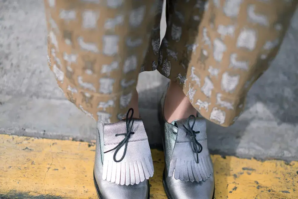 Opté por prendas en la gama de los grises y plateados. Por eso sumé este sweater y el collar con detalle de mármol, así como los zapatos abotinados.