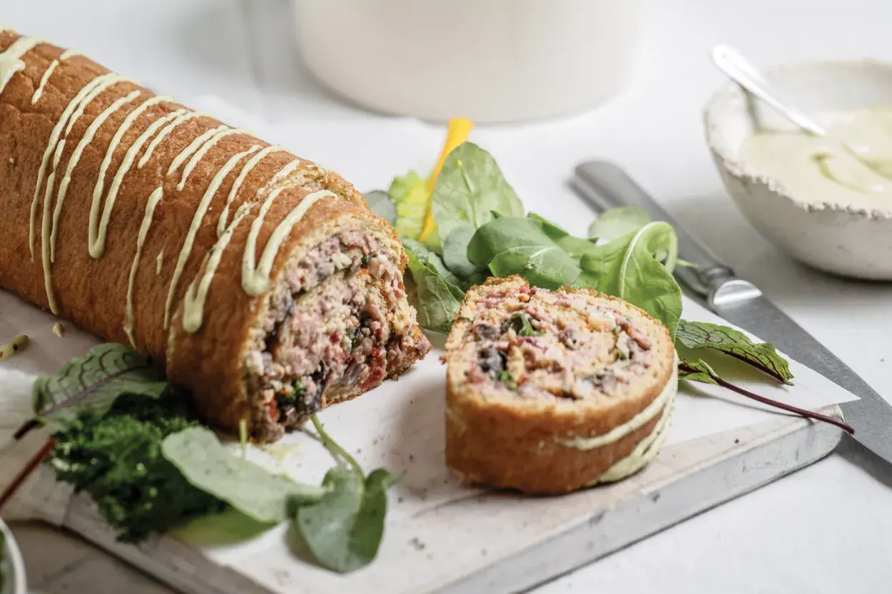 Armado: sobre el pionono, untar una capa fina de mayonesa vegana, luego colocar el "atún", extender el relleno de 2 a 3 ml, incorporar en forma de lluvia la rúcula, el huevo duro, los champiñones, el queso pategrás, los tomates secos y las aceitunas negras. Enrollar suavemente y terminar decorando con la mayonesa.
