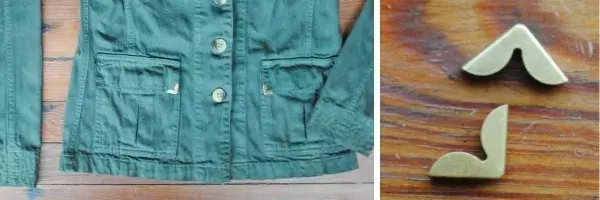 Luego le colocamos unas punteras color bronce viejo en los bolsillos (Se colocan en las esquinas y se presiona con una pinza para ajustarlos)