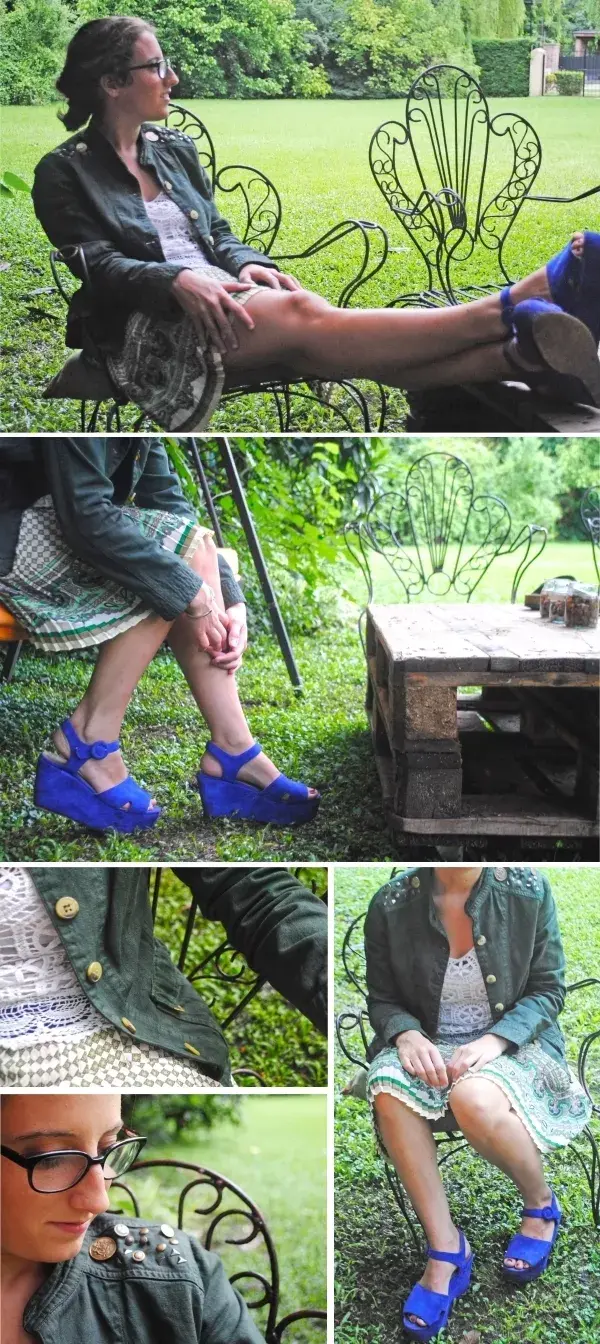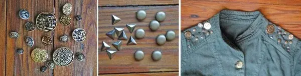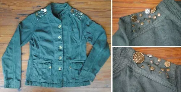 En los recortes que tenía en el hombro le cosimos botones de diferentes diseños, tachas autoadhesivas y tachas a presión. Esta idea esta buena por qué se puede hacer con lo que quieran: botones viejos, pedrería, todo tipo de tachas, etc. Es ideal para usar pedrería o botones viejos que tenemos por ahí y si son todos diferentes mucho mejor!