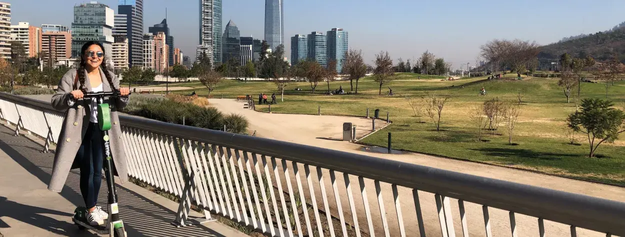 - Parque Bicentenario: uno de los espacios verdes más nuevos y lindos, con vistas increíbles al skyline de Santiago, a los cerros y a la cordillera. Es un buen escenario para probar los scooters eléctricos, el medio de transporte ecológico favorito de las grandes ciudades del mundo. Descargá la app de Lime, el paseo cuesta CLP 400 para desbloquear y CLP 100 por minuto.