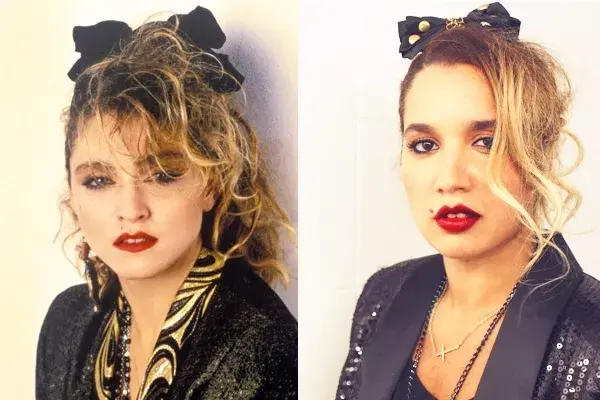 Porque si hay un ícono femenino de los 80´s , esa es Madonna. Con esa sombra oscura llevada hasta la ceja los pómulos marcados con colores ladrillo y la boca oscura. El pelo descontrolado y decorado con pañuelos y esos atuendos pasados en capas y capas de remeras, tops, medias rotas, shorts cortados y borcegos. Era una bomba espectacular.