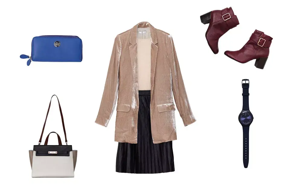 Blazer, (MNG para Falabella, $4990), Suéter (Las Pepas, $1990), Falda (Giesso, $2396), Reloj (Swatch, $3395), Cartera (Prüne, $3590), Botas (Vía Uno, $3499), Billetera (Quiero June, $2670).