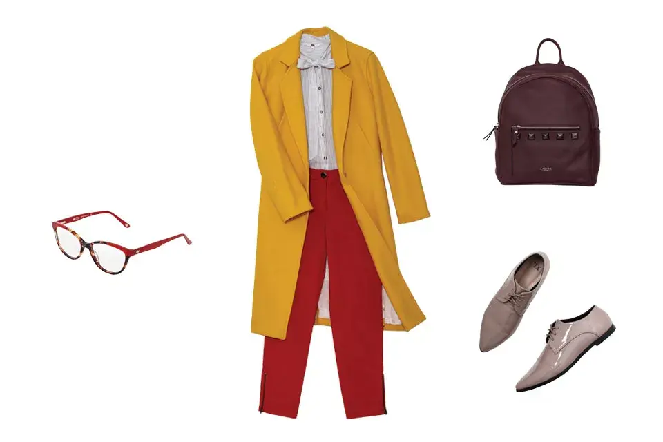 Abrigo (Ayres, $8190), Pantalón (Desiderata, $1680), Camisa con lazo (Levi´s, $918), Mochila (Lazaro, $3290), Gafas, (Fleur, $2490), Acorodnados (XL, $1250).