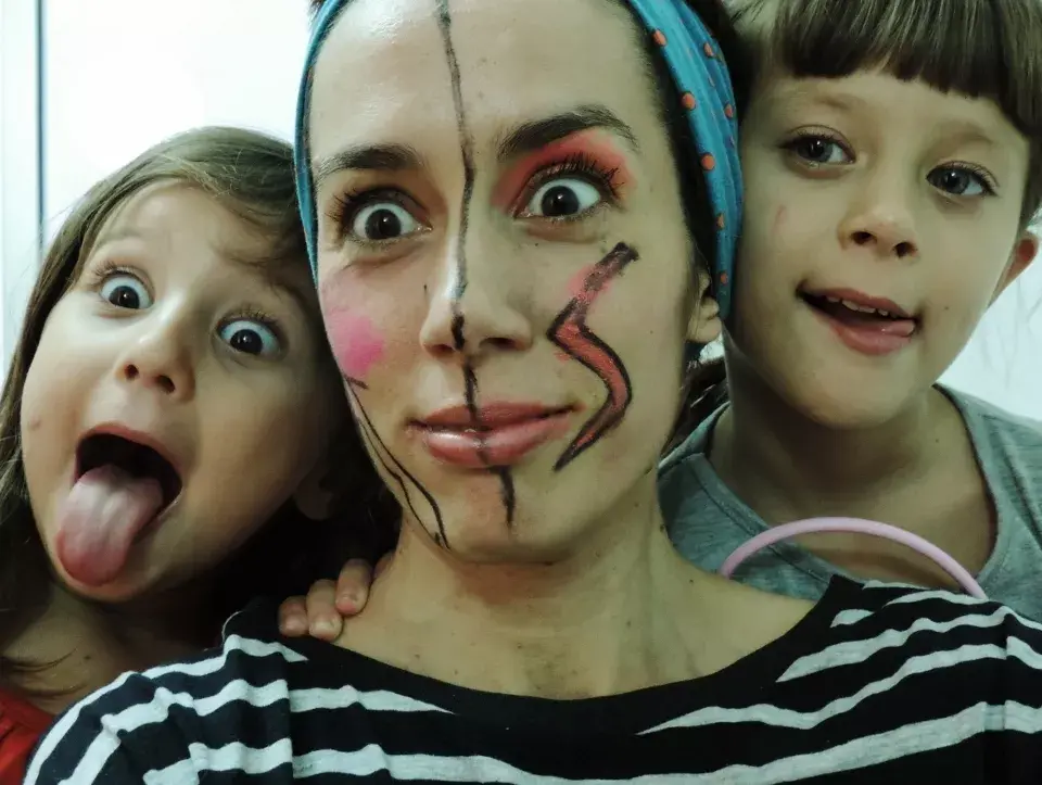 DIVIDIDA: tengo dividida hasta la cara. Hijas dibujaron esa línea, así cada una tenía su mitad para pintarme