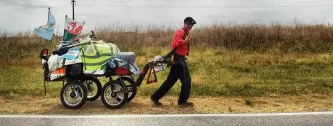 En el carro carga algo de comida enlatada, un inflador y la carpa en la que durmió la mayoría de las noches desde octubre. Por ahí, lo invitan a descansar en alguna casa. Más seguido le proveen comida, una ducha caliente, la posibilidad de lavar la ropa, como un par de días atrás lo hizo una señora en Trenque Lauquen. A veces le dan algo de dinero. Otra mujer, en La Pampa, le preguntó: "¿Se ofende si le ofrezco esto?", extendiéndole un billete de 50. "Y la verdad que no, ¿cómo me va a ofender? Al contrario, me ayuda. No tengo fortuna. Lo único que no acepto es que me lleven en camión. ¡Todo el tiempo los camioneros me preguntan si quiero que me lleven! Siempre les agradezco, ¿pero cuál sería la gracia?".
