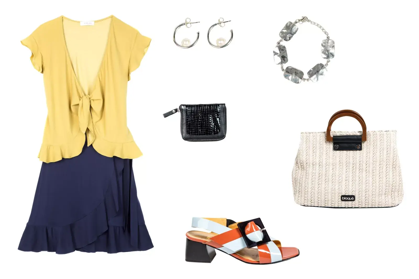 Blazer, Markova, $5400. Top de seda, Giesso, $3386. Anteojos de sol, XL, $1390. Collar, India Style, $590. Falda, Etiqueta Negra, $4500. Reloj, XL, $1950. Sandalias de charol, Prüne, $4390. Cartera, Prüne, $3290.