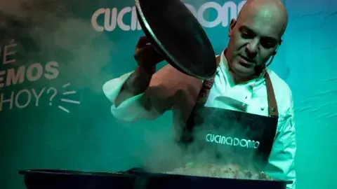 Para nuestra sorpresa, tanto el plato salado como el dulce el chef Giorgini los preparó solamente recurriendo a las cacerolas de Cucina Donna. La tapa con encastre forma un anillo de vapor que permite cocinar todo tipo de alimentos en su propio jugo, evitando la evaporación de nutrientes y reduciendo el consumo de agua. Por lo tanto, comidas saludables al vapor inclusive para los más chicos de la familia, también se pueden preparar en la cacerola.